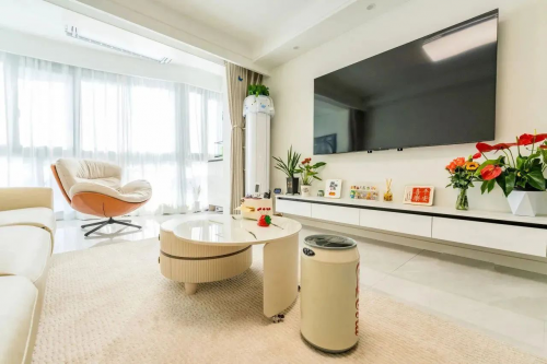 整个家以白色为主调ღ★,营造出一种宁静而纯净的氛围ღ★。客厅宽敞明亮ღ★,无主灯设计使得空间更加通透ღ★。沙发ღ★、茶几ღ★、电视柜等家具的选择ღ★,既注重了舒适性ღ★,又体现了简约的美学ღ★。阳台被打造成了一个实用的收纳空间ღ★,定制的柜子将杂物一一收纳其中ღ★,使得整个家看起来井井有条ღ★。